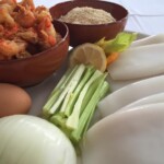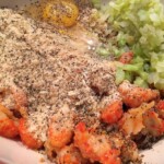- Mix gently in a bowl: Crawfish, sautéed vegetables, breadcrumbs, egg, lemon- and orange juice, 2 tbsp cream, salt and pepper to taste and a pinch of harissa spice. (Alternatively use paprika- and cayenne powder.)