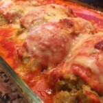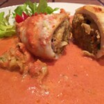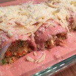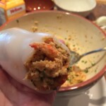 - Fill the quid tubes with the crawfish stuffing and place on top of the sauce. Sprinkle with shredded cheese and parmesan.
