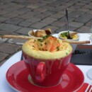 One of my most unforgettable culinary surprises took place in popular Saint Malo though, where I would have expected the tourist-typical fare …. Sitting outside -I always do, even if I have to wear my coat- at a small bistro table, I opted for a ‘Lobster Cappuccino’, what I thought was going to be a cute little soup with some fresh bread. Out came, served in a fire red cup on a fire red saucer, an incredibly aromatic dish accompanied by house-made bread sticks and warm-from-the-oven croutons. Piping hot, creamy and topped with frothed lobster cream, sitting on it a generous portion of steamed lobster meat. I was afraid to taste it, worrying that the flavours would not deliver what the presentation promised. How wrong I was! To this day I can remember the heavenly perfection, the balance of the flavours, the textures, the smell …. this was the moment when I understood the term ‘food porn’. I have made promises to myself to go back and hopefully find that the Bistro still exists. I will definitely go there very hungry.