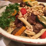 - Drain pasta, put it back in the pot on medium heat, add meat and vegetables. Drizzle a little olive oil all over and stir gently until just mixed and everything is nicely hot.
