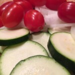 - Cut onion and zucchini in slices, peppers in long strips. Peel garlic and chop finely.